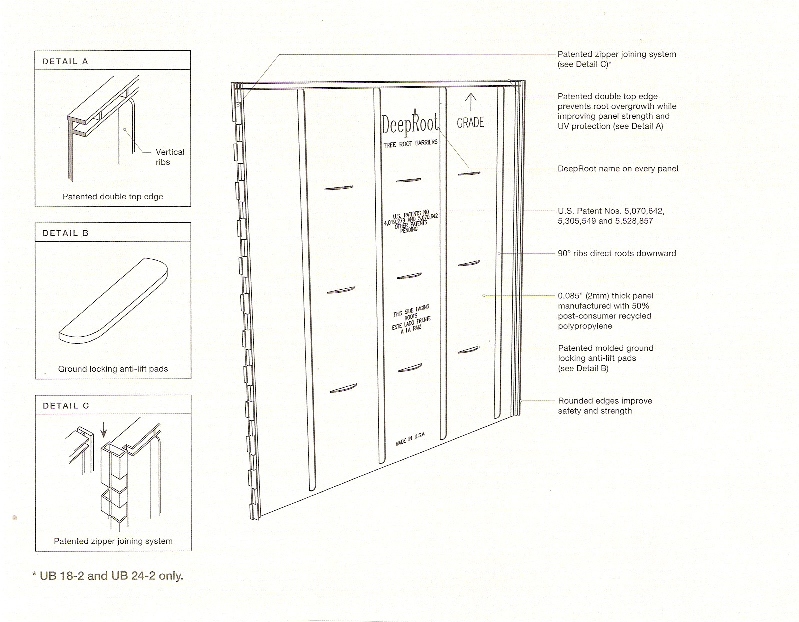Les barrières à racines d'arbres de DeepRoot® sont des barrières mécaniques brevetées qui redirigent les racines des arbres vers le bas et les éloignent des surfaces à protéger (trottoirs, patios, entrées de garage, cabanons, terrains de tennis, piscines creusées, solages de maison...) prévenant ainsi des dommages coûteux.