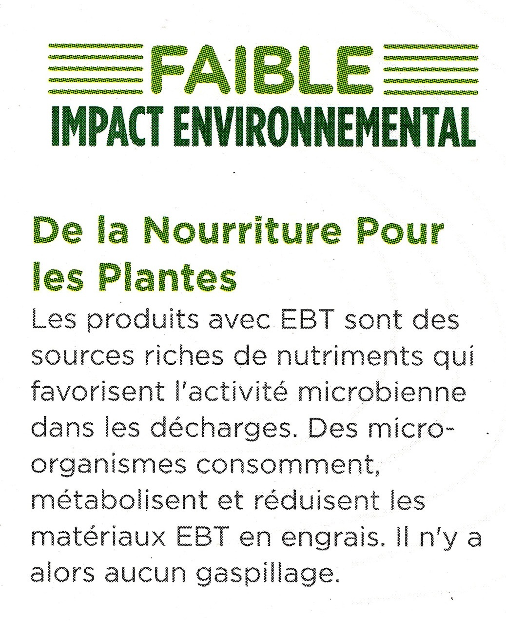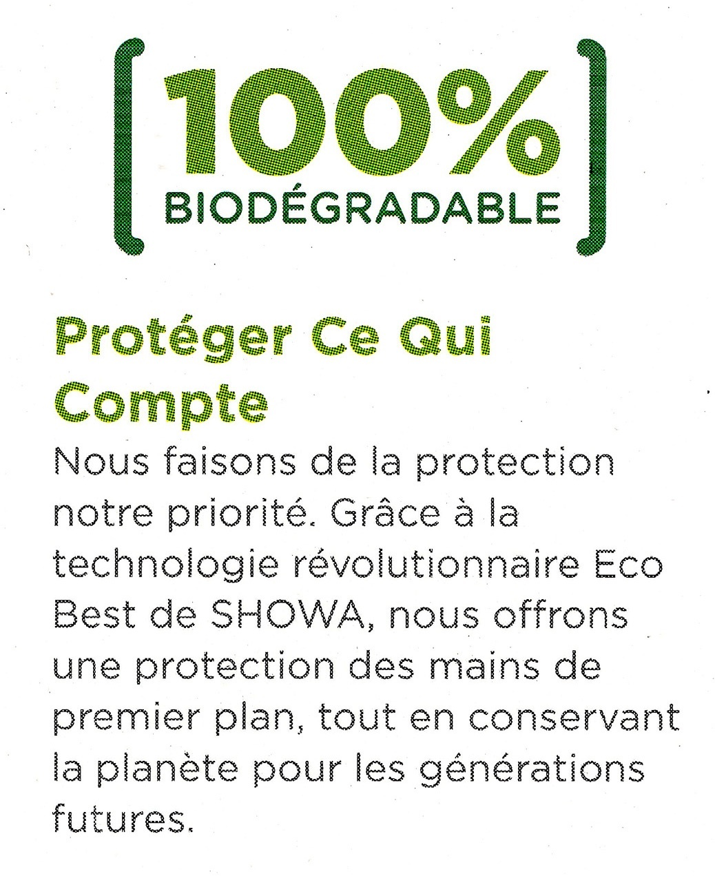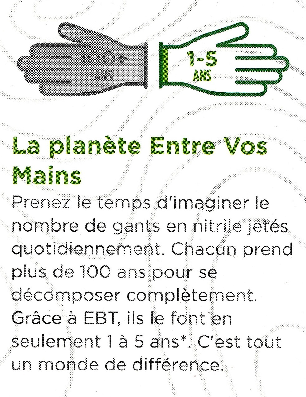 En consommant le matériel Éco Best, les micro-organismes excrètent des enzymes qui dépolymérisent le nitrile. Le résultat final de cette digestion sont des biogaz et de l'humus inerte. L'Éco Best maintient les mêmes propriétés physiques que le nitrile régulier et peut être employé dans les mêmes applications et sans aucune perte de performance quel qu'elle soit. De plus ce nitrile offre la sensation d'une seconde peau et possède un faible risque de réactions allergiques.