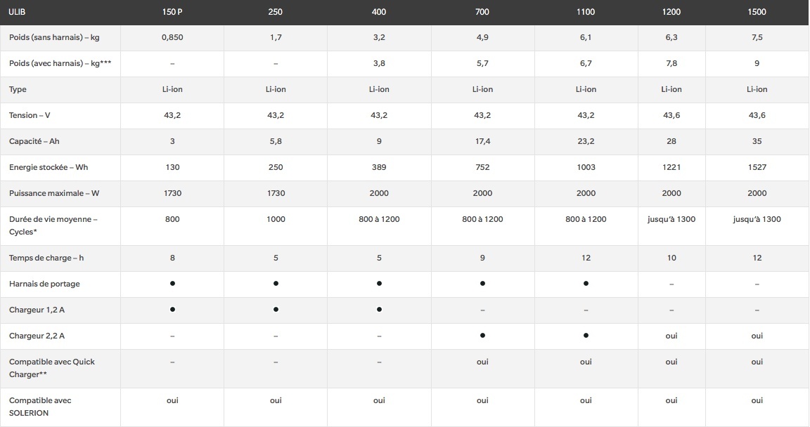 La batterie Ultra Lithium 1500 vous permet d'alimenter tous les outils Pellenc à l'exception du Vinion (Lixion), Prunion (Treelion) et Fixion. Elle offre la plus grande autonomie, 50% par rapport à la version ULiB 1100et une puissance phénomènale. Avec un poids de seulement 9.0 kg, harnais inclus, elle développe 1527 Wh, amplement d'énergie pour une grosse journée de travail avec la plupart des outils. Cette batterie possède un écran IHM géré par un processeur intelligent permet d’optimiser l’utilisation de la batterie. Il indique de nombreuses informations, tels que le temps de travail par outil, la puissance maximum délivrée par la batterie ou encore des alertes « défauts ». De plus, le mode clignotant de l’écran et les catadioptres permettent à l’opérateur d’être visible à tout moment et en particulier dans la pénombre.