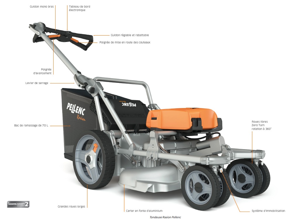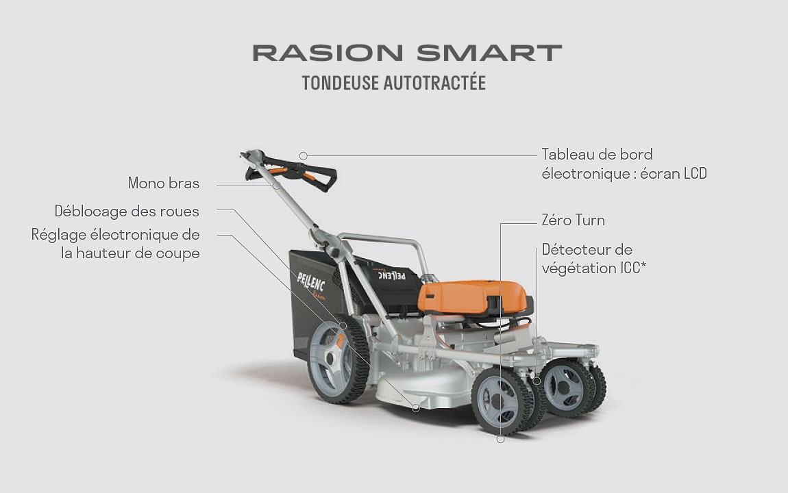 Son niveau d’étanchéité IP54, protégeant des poussières et de la pluie, permet de travailler en tout confort et par tous les temps. Pesant moins de 30 Kg, la tondeuse Rasion tond de manière régulière la pelouse sans laisser de traces de roues. Son guidon et ses poignées sont réglables afin de s’adapter à toutes les morphologies. Son rangement est facilité par sa position de transport et d’entreposage compact à la verticale ce qui assure en même temps un nettoyage sécuritaire du dessous de la tondeuse. Fini la gestion de l’essence, de l’huile ou du mélange huile-essence et de leur consommation ce qui évite les encrassements, réduit l’entretien et les frais connexes à celle-ci. Ne produisant que 84 dB de nuisance sonore en plus de l’absence de nuisance olfactive la tondeuse Rasion offre la possibilité de tonte dans les zones sensibles au bruit à toutes heures de la journée. Déclinable en trois modèles, veuillez vous référez au tableau ci-joint pour découvrir les caractéristiques de chacun. *Intelligent Cutting Control, brevet Pellenc